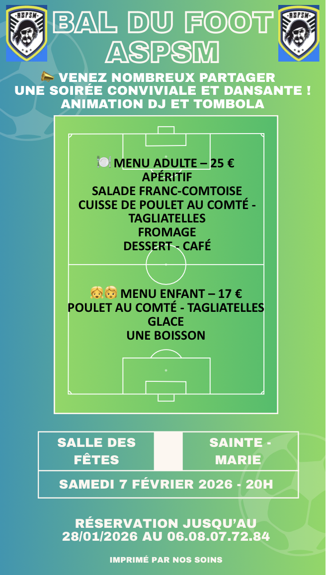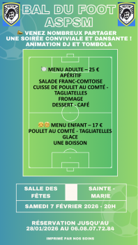 L'ASPSM organise son "bal du foot" annuel le samedi 7 février 2026 à 20H, à la salle des fêtes de Ste Marie...avec animation DJ et tombola!